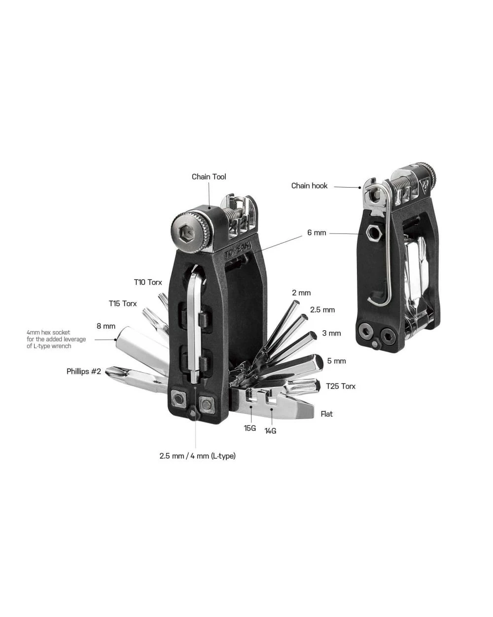 Le multitool Topeak Ninja ToolBox 16 est doté de 16 fonctions essentielles pour le dépannage de votre vélo sur la route :
