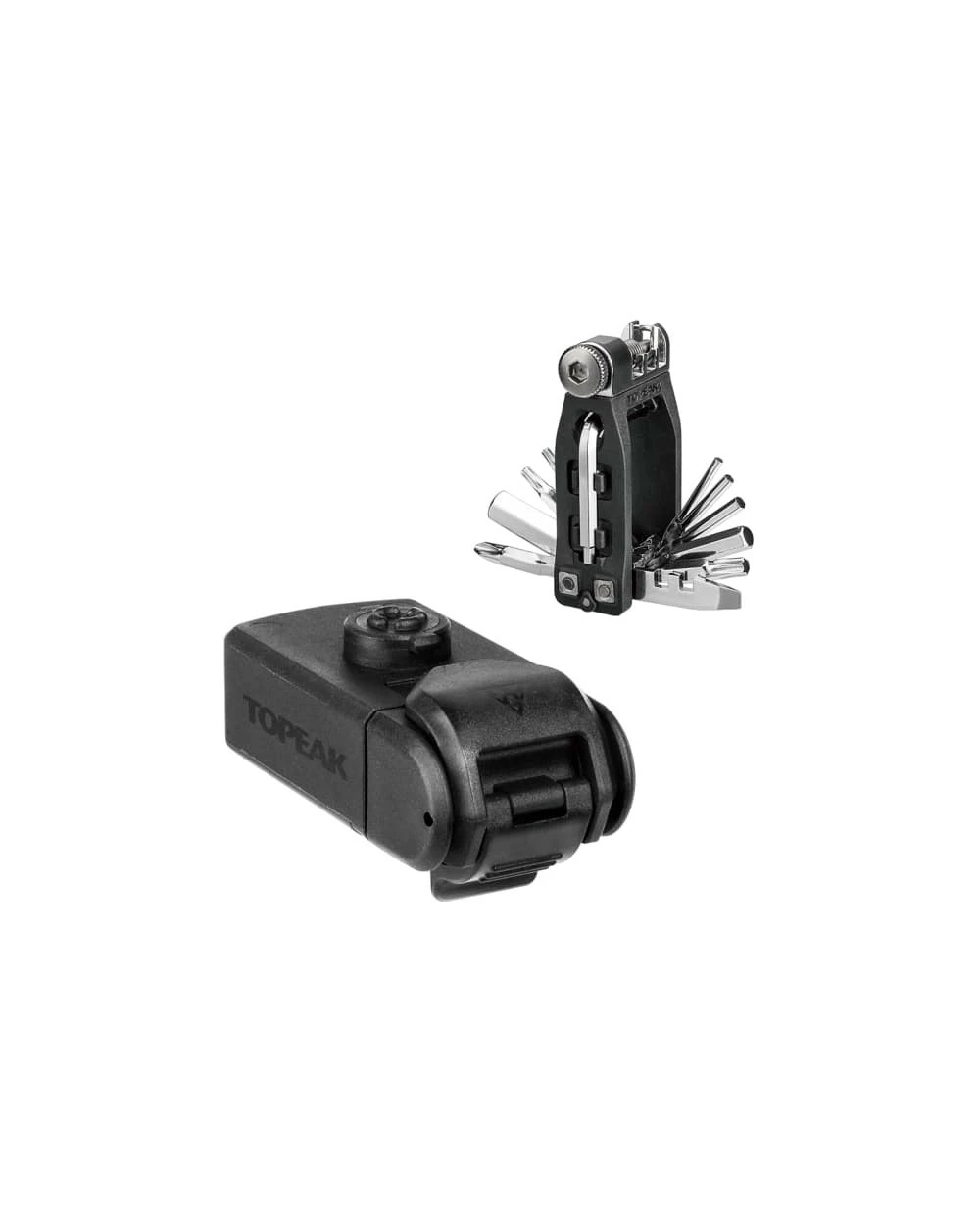 Le multitool Topeak Ninja ToolBox 16 est une innovation très astucieuse dont vous pourrez plus vous passer. Le multitool est ultra-compact avec 16 fonctions et se loge dans une petite boite, la Ninja ToolBox, qui se fixe sur le porte-bidon pour se faire discret grâce à sa fixation QuickClick® Mounting System.