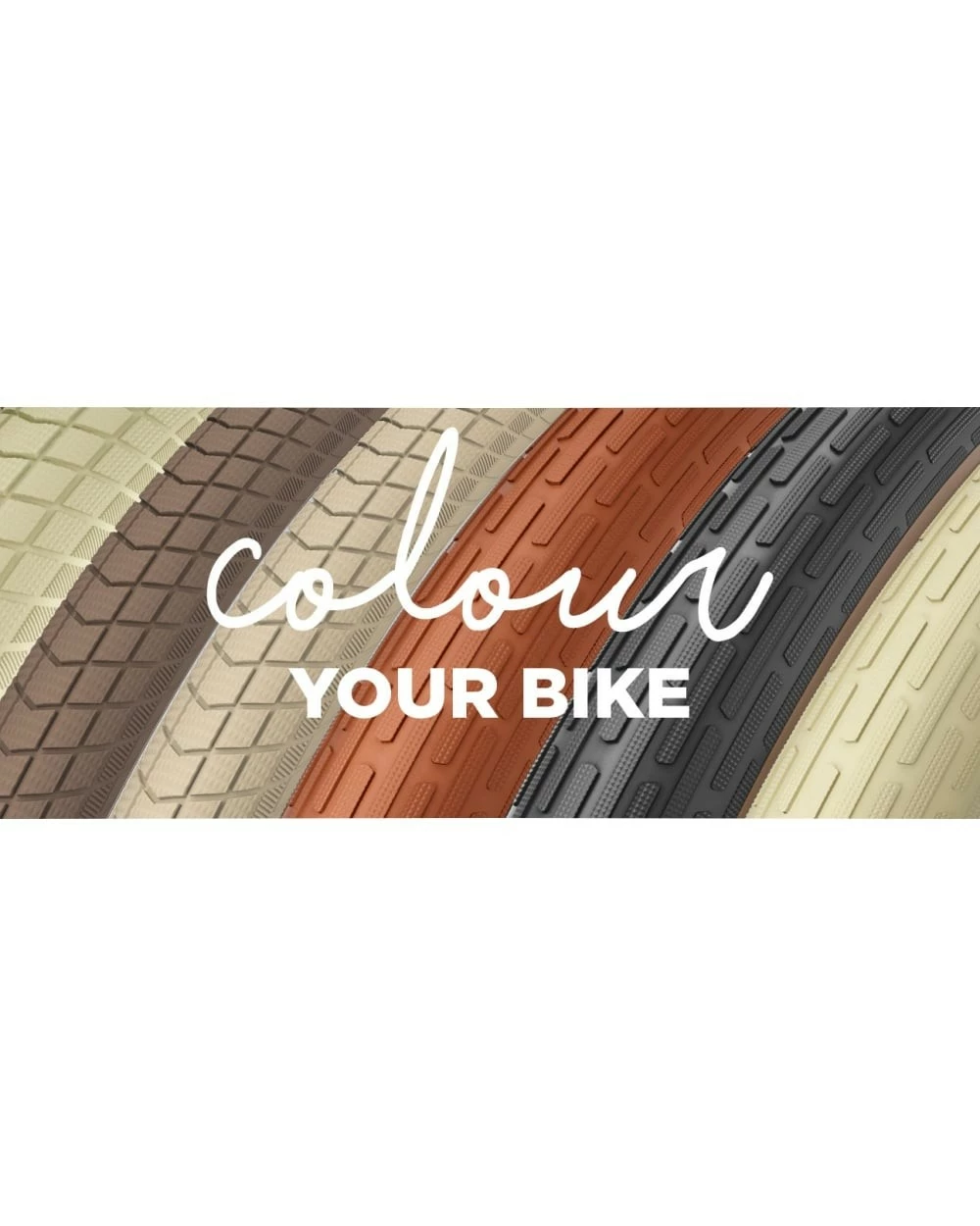 Le pneu est disponible en plusieurs tailles et couleurs pour l’assortir à votre vélo.